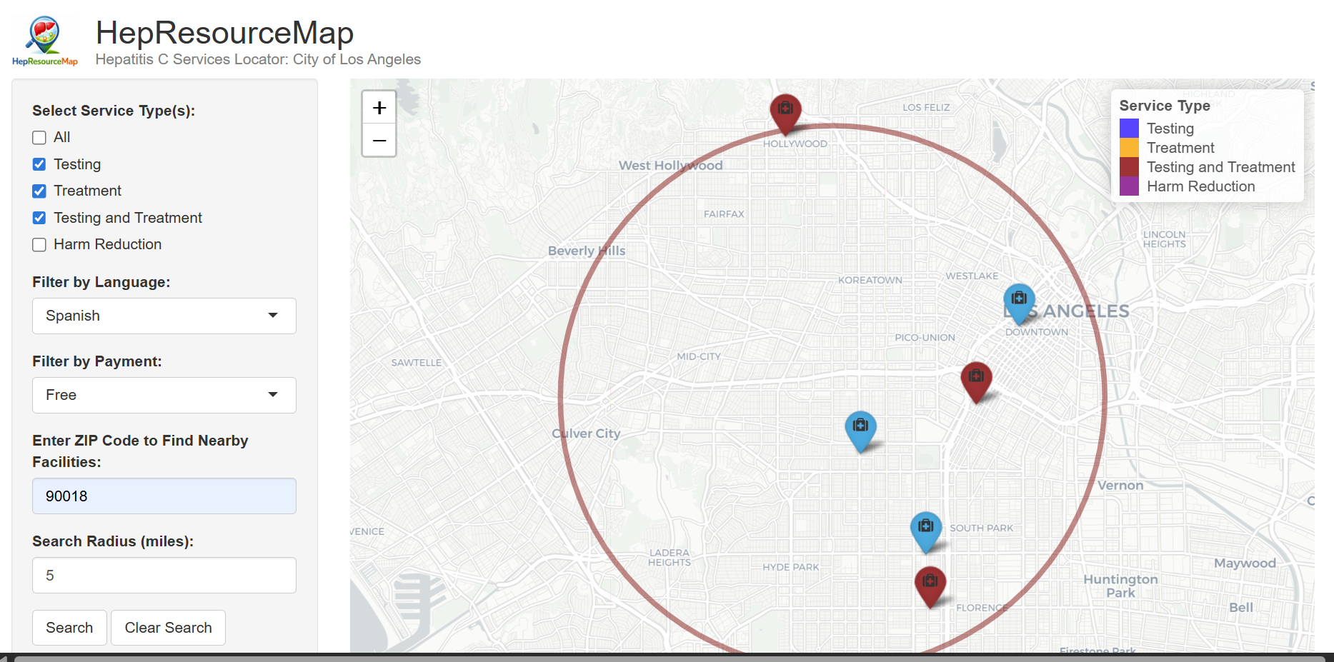 HepResourceMap aims to support residents of the City of Los Angeles and individuals diagnosed with HCV by helping them locate nearby HCV testing and treatment sites, as well as public health agencies, to identify spatial access gaps.